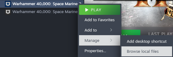 2. بعد الانتهاء من التنزيل، قم باستخراج الملف إلى سطح المكتب أو مجلد آخر، ثم افتح برنامج Steam وابحث عن لعبة *Warhammer 40,000: Space Marine 2*، ثم انقر بزر الماوس الأيمن واختر "إدارة"، ومن ثم "استعراض الملفات المحلية".