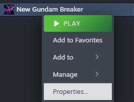 2. بعد التنزيل، قم باستخراج الملفات إلى سطح المكتب أو مجلد آخر، ثم افتح برنامج Steam وابحث عن لعبة New Gundam Breaker. انقر بزر الماوس الأيمن على اللعبة وحدد "الخصائص".