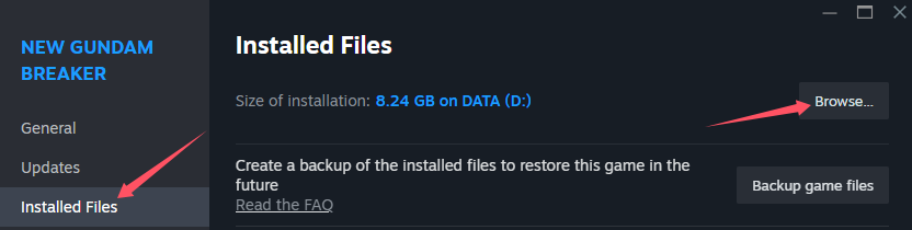 ملاحظة: إذا كنت ترغب في استعادة الملف الأصلي، انتقل إلى خصائص اللعبة، وانقر على "الملفات المحلية"، ثم انقر على "التحقق من سلامة ملفات اللعبة" لاستعادة الملف، أو قم بعمل نسخة احتياطية مسبقة من ملف "NewGundamBreaker.exe".
