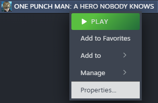 2. بعد الانتهاء من التنزيل، قم باستخراج الملف إلى سطح المكتب أو مجلد آخر، ثم افتح برنامج Steam وابحث عن لعبة *ون باتش مان: هيرو نوبدي نوونز*، ثم انقر بزر الماوس الأيمن واختر "الخصائص".
