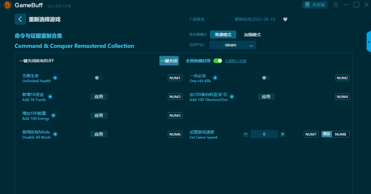 此外,Command & Conquer Remastered Collection修改器还包含“禁用所有模组”功能,可帮助玩家快速切换回纯净的游戏环境,解决因模组冲突导致的崩溃或不稳定问题,确保联机或录制内容的稳定性。而“设置游戏速度”功能则允许玩家自由调节游戏节奏,无论是慢速微操学习战术,还是高速推进享受快节奏战斗,都能轻松实现。