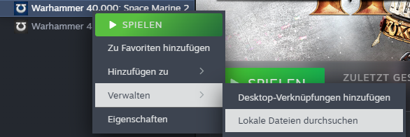 2. Nachdem der Download abgeschlossen ist, entpacken Sie die Datei auf den Desktop oder in einen anderen Ordner. Öffnen Sie dann Steam, suchen Sie nach *Warhammer 40,000: Space Marine 2*, klicken Sie mit der rechten Maustaste auf „Verwalten“ und anschließend auf „Lokale Dateien durchsuchen“.
