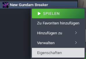 2. Nachdem Sie das Archiv heruntergeladen haben, entpacken Sie es auf Ihren Desktop oder einen anderen Ordner, öffnen Sie Steam und suchen Sie nach New Gundam Breaker. Klicken Sie mit der rechten Maustaste auf das Spiel und wählen Sie „Eigenschaften“.
