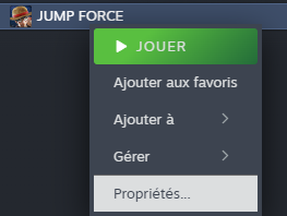 2. Une fois le téléchargement terminé, décompressez les fichiers sur votre bureau ou dans un autre dossier, puis ouvrez Steam et trouvez JUMP FORCE. Cliquez avec le bouton droit sur le jeu, puis sélectionnez « Propriétés ».