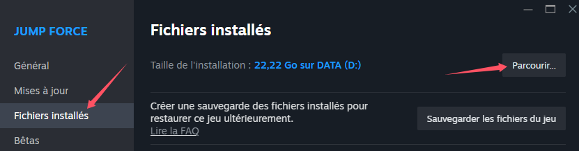 Remarque : Si vous souhaitez restaurer le fichier d'origine, accédez aux propriétés du jeu, cliquez sur « Fichiers locaux », puis sur « Vérifier l'intégrité des fichiers du jeu » pour restaurer le fichier ou faites une sauvegarde préalable de « JUMP_FORCE.exe ».