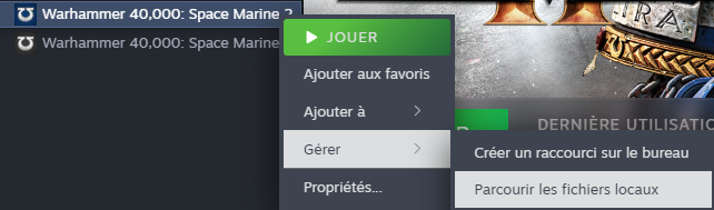 2. Une fois le téléchargement terminé, décompressez-le sur le bureau ou dans un autre dossier. Ensuite, ouvrez Steam, trouvez *Warhammer 40,000 : Space Marine 2*, faites un clic droit sur « Gérer », puis sélectionnez « Parcourir les fichiers locaux ».