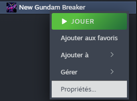 2. Une fois le téléchargement terminé, décompressez les fichiers sur votre bureau ou dans un autre dossier, puis ouvrez Steam et trouvez New Gundam Breaker. Cliquez avec le bouton droit sur le jeu, puis sélectionnez « Propriétés ».