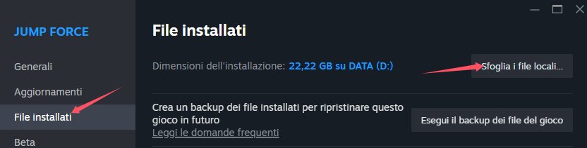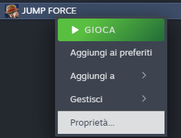 Nota: Se desideri ripristinare il file originale, vai alle proprietà del gioco, clicca su "File locali" e poi su "Verifica integrità dei file di gioco" per ripristinare il file oppure crea una copia di backup anticipata di "JUMP_FORCE.exe".