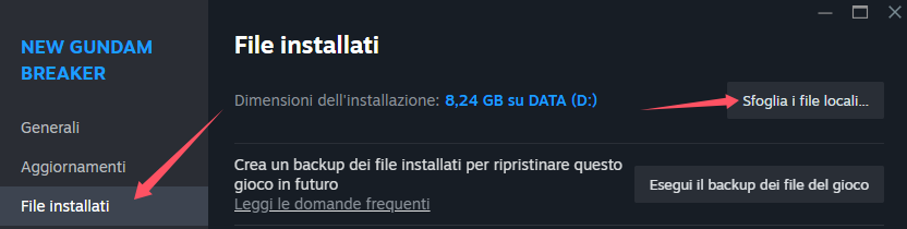 Nota: Se desideri ripristinare il file originale, vai alle proprietà del gioco, clicca su "File locali" e poi su "Verifica integrità dei file di gioco" per ripristinare il file oppure crea una copia di backup anticipata di "NewGundamBreaker.exe".