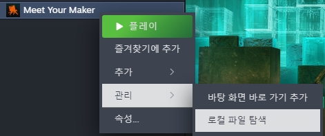 2. 다운로드가 완료되면 게임의 루트 디렉터리에 바로 압축을 푼 후 Steam을 열어 *미트 유어 메이커*를 찾은 다음 오른쪽 버튼으로 클릭하여 "관리" > "로컬 파일 찾아보기"를 선택합니다.