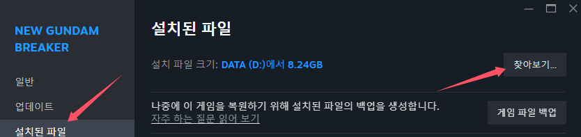 주의: 원본 파일로 복원하려면 게임 속성으로 이동해 '로컬 파일'을 클릭한 후 '게임 파일 무결성 검사'를 클릭하면 파일을 복구할 수 있으며, 미리 'NewGundamBreaker.exe' 파일을 백업해 두는 것도 좋습니다.