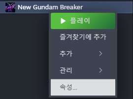 2. 다운로드 후 바탕화면이나 다른 폴더에 압축을 풀고 Steam을 열어 New Gundam Breaker 게임을 찾은 후 우클릭하여 '속성'을 선택합니다.