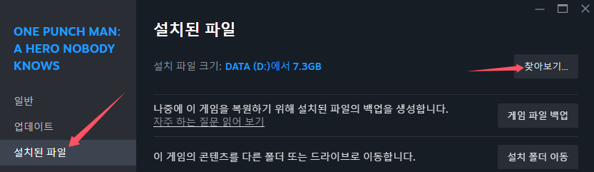 참고: 나중에 원본 파일로 되돌리려면 게임 속성의 "로컬 파일"에서 "게임 파일 무결성 검사"를 실행하거나 미리 "ONE PUNCH MAN A HERO NOBODY KNOWS.exe" 파일을 백업해 두세요.