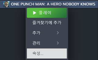 2. 다운로드가 완료되면 바탕화면 또는 다른 폴더에 압축을 풀고 Steam을 열어 *원펀맨: 어 히어로 노바디 노운즈*를 찾은 후 오른쪽 버튼으로 클릭하여 "속성"을 선택합니다.