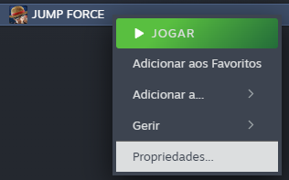 2. Após o download, extraia os arquivos na área de trabalho ou outra pasta, depois abra o Steam e localize JUMP FORCE. Clique com o botão direito no jogo e selecione "Propriedades".