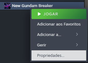 2. Após o download, extraia os arquivos na área de trabalho ou outra pasta, depois abra o Steam e localize New Gundam Breaker. Clique com o botão direito no jogo e selecione "Propriedades".