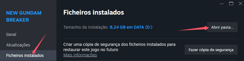 Observação: Se quiser restaurar o arquivo original, acesse as propriedades do jogo, clique em "Arquivos Locais" e depois em "Verificar Integridade dos Arquivos do Jogo" para restaurar o arquivo ou faça uma cópia de segurança do "NewGundamBreaker.exe" com antecedência.