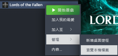 2. 下載完成後,將檔案解壓縮至桌面或其他資料夾,然後打開 Steam,找到《墮落之主》,右鍵點擊遊戲,選擇「管理」,再點擊「瀏覽本機檔案」以準確進入遊戲的根目錄。