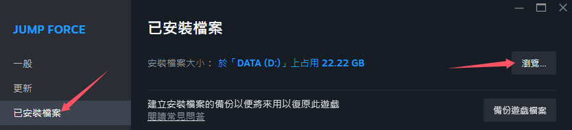 注意:如需還原檔案,可以前往遊戲內容頁面,點擊「本機檔案」,再點擊「驗證遊戲檔案完整性」來恢復檔案,或者可預先備份「JUMP_FORCE.exe」。