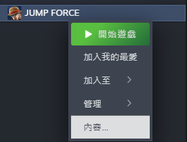 2. 下載完成後,將檔案解壓到桌面或其他資料夾,然後打開 Steam,找到 JUMP FORCE,右鍵點擊遊戲,然後選擇「內容」。