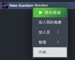 2. 下載完成後,將檔案解壓到桌面或其他資料夾裡,然後打開 Steam 找到「新高達破壞者」,右鍵點擊遊戲,然後選擇「內容」。