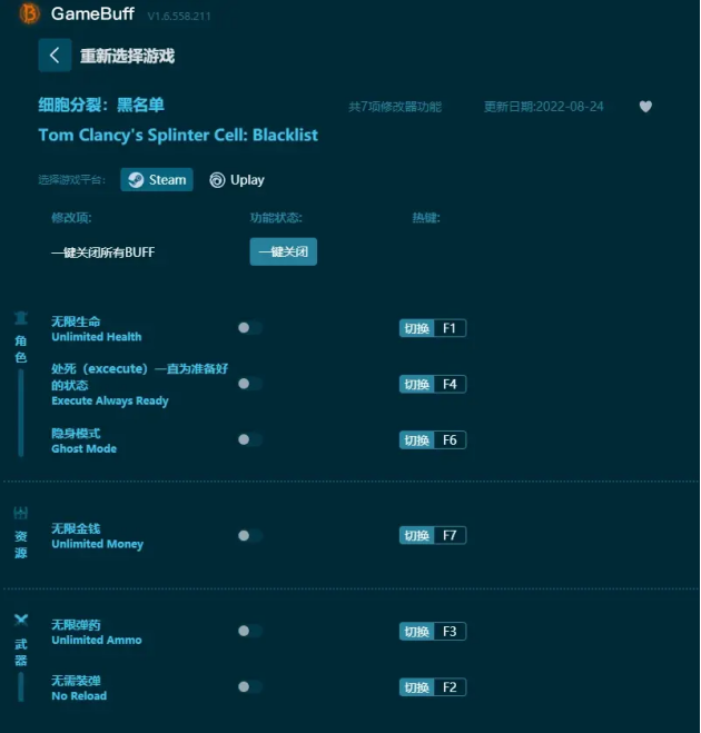 细胞分裂:黑名单修改器7项功能,支持无限生命、无限弹药、无需装弹等